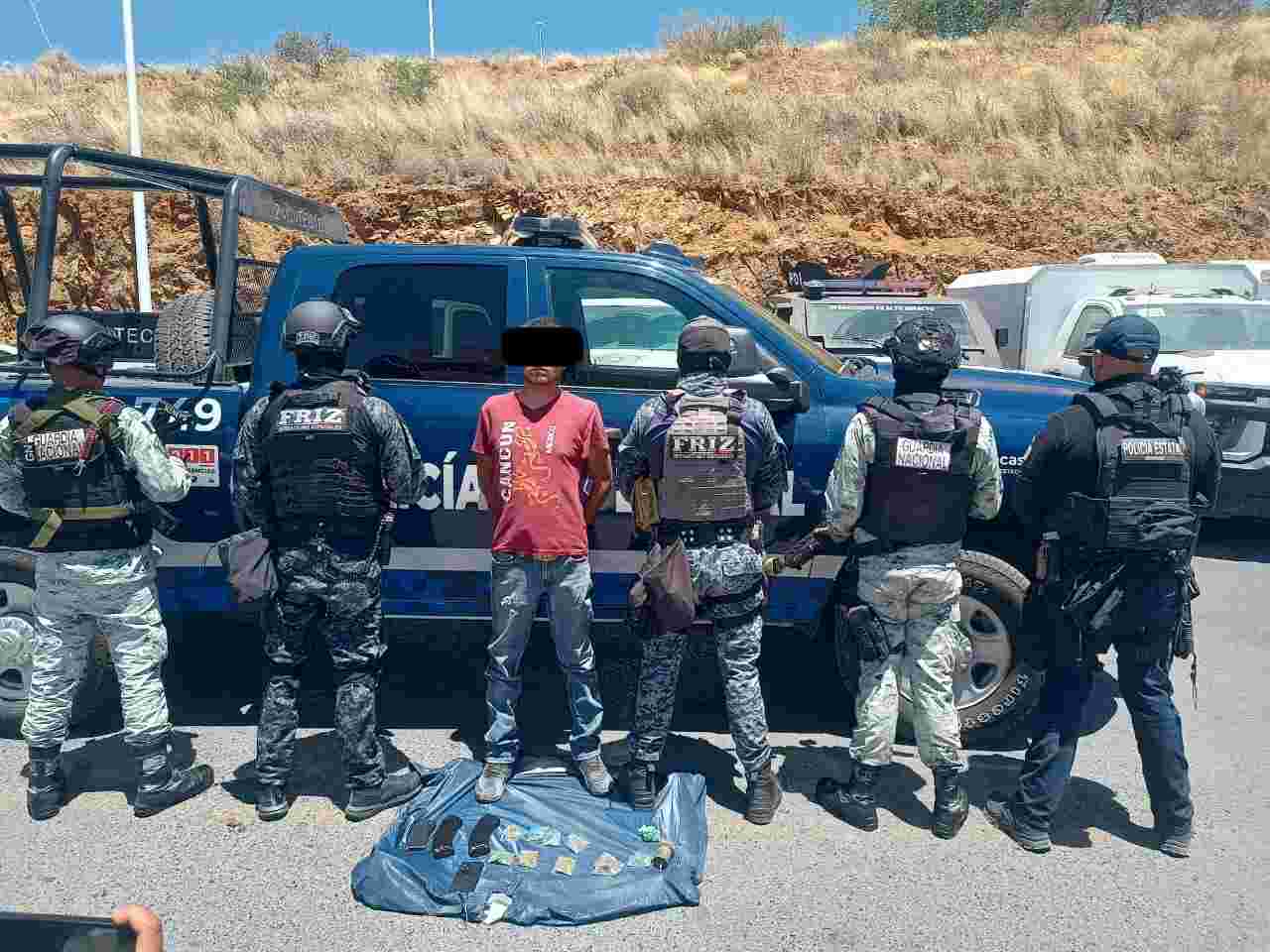 Villa García, Zac.- Como parte de las acciones que el Gobierno de Zacatecas implementa para fortalecer la seguridad, la paz y el bienestar de la ciudadanía, las Fuerzas de Seguridad de los tres órdenes de gobierno lograron la detención de un hombre en posesión de droga, cargadores, cartuchos útiles y un artefacto explosivo de fabricación artesanal.